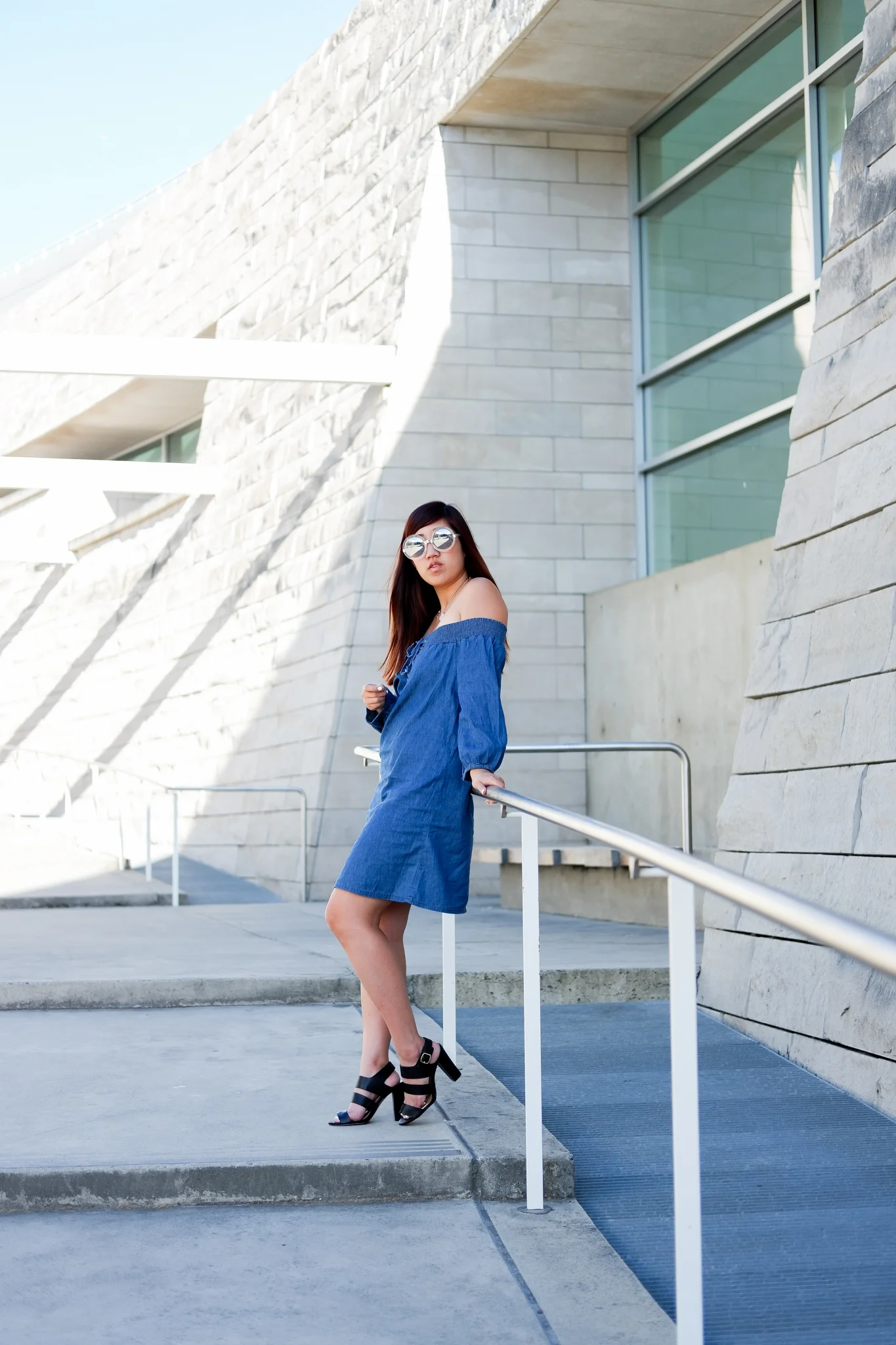Sunglasses: Sunglass LA | Necklace: Shop BEXO | Denim Dress: Factory Fashion | Heels: De Blossom Shoes